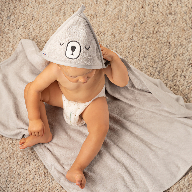 Izrađen je od visokokvalitetnog mekog pamuka i savršeno upija vlagu te uspješno štiti bebu od hladnoće. Vrlo je nježan, pa ne iritira kožu. Široki kroj ne ograničava djetetove pokrete. Ušivena kapuljača štiti mokru glavu .