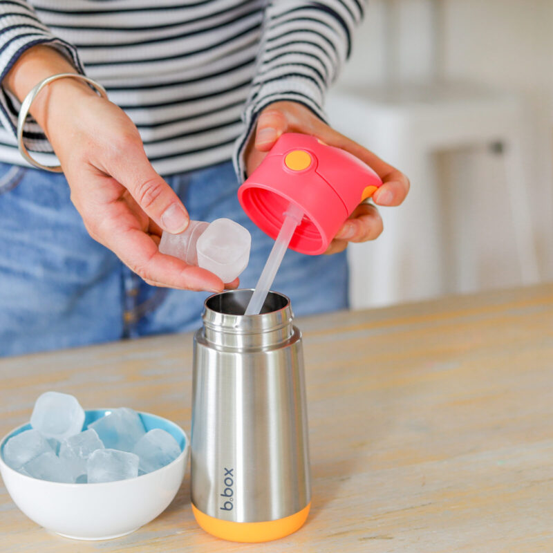 Dvostruke stijenke od nehrđajućeg čelika održavaju tekućine hladnim do 8, odnosno toplim do 6 sati, tako da klinci ostaju hidrirani, bez obzira na vremenske uvjete. Otvaranje na potisak i praktična ručka, malenima su idealne za lako rukovanje . Moderan dizajn i estetski izgled prilagođeni su i većoj djeci. Bočice su dostupne u različitim b.box bojama. Djeca obožavaju našu silikonsku slamku. Roditelji obožavaju što nema curenja kada je bočica zatvorena.