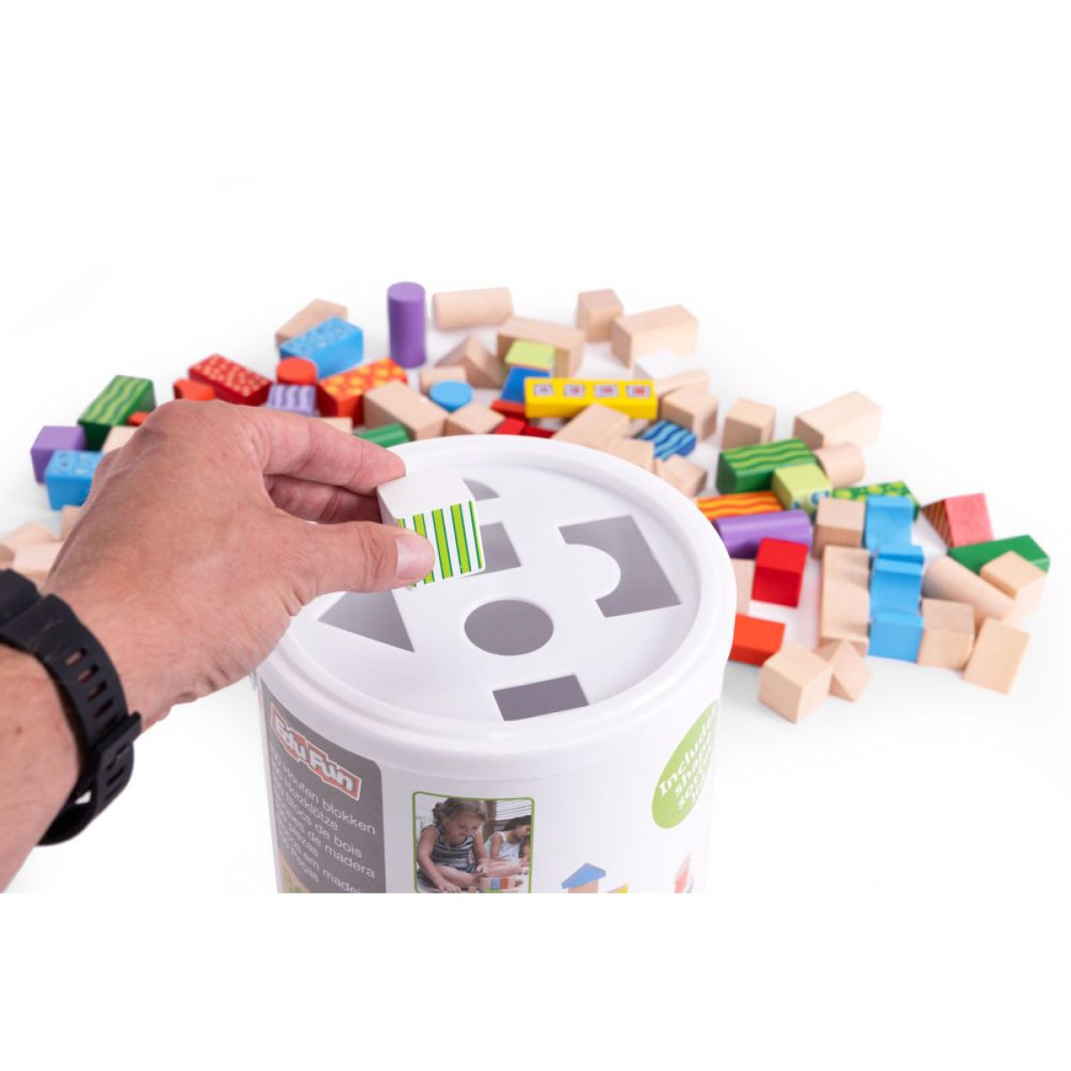 Razvrstavač oblika će obogatiti igru usklađivanjem blokova s odgovarajućim oblicima na plastičnom poklopcu koji pristaje na spremnik. Na ovaj način dijete uči razlikovati jednostavne oblike, što pozitivno utječe na njegov razvoj. Spremnik služi i za spremanje i prenošenje blokova, a pohranjivanje i prenošenje dodatno podučava dijete da se brine urednosti prostora za igru. Spremnik se također može koristiti kao mjesto za pohranu drugih igračaka, bojica i drugih sitnica.