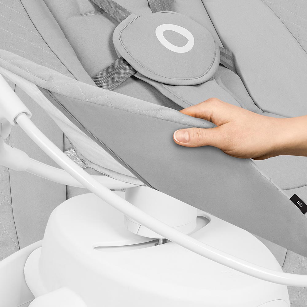 Dobro oblikovano široko sjedalo ne samo da nudi udobnost, već i olakšava postavljanje djeteta u ljuljačku. Pojas u pet točaka sa zaštitnom podstavom osigurava bebu u ljuljački. Ljuljačka je iznimno lagana, pa se bez napora može premjestiti na bilo koje mjesto, ovisno o potrebama. Protuklizne podloge postavljene na podlogu štite pod od grebanja. Uklonjiva presvlaka dizajnirana je za jednostavno čišćenje.