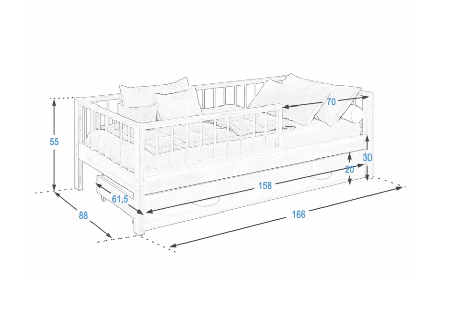 Ugradnja sigurnosne ograde s lijeve ili desne strane omogućuje vam prilagodbu dječjeg kreveta rasporedu sobe i zaštitu djeteta od slučajnih padova dok ne bude spremno samostalno zaspati. Osim toga, praktična ladica na kotačima omogućuje jednostavno spremanje posteljine, igračaka i odjeće, pomažući u održavanju urednosti sobe i uštedi prostora.