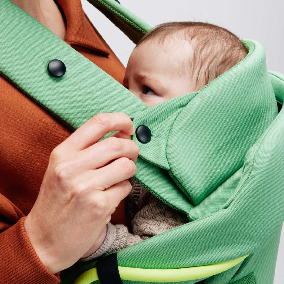 - Integrirana kabanica sa zaštitom od sunca UVP 50 : Skrivena u gornjem dijelu nosiljke, pričvršćuje se na ramenice
