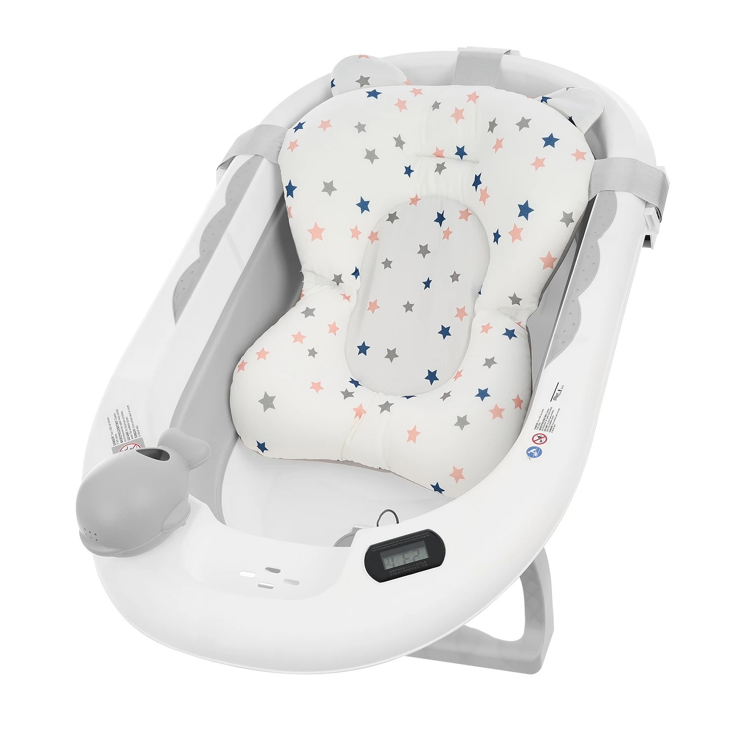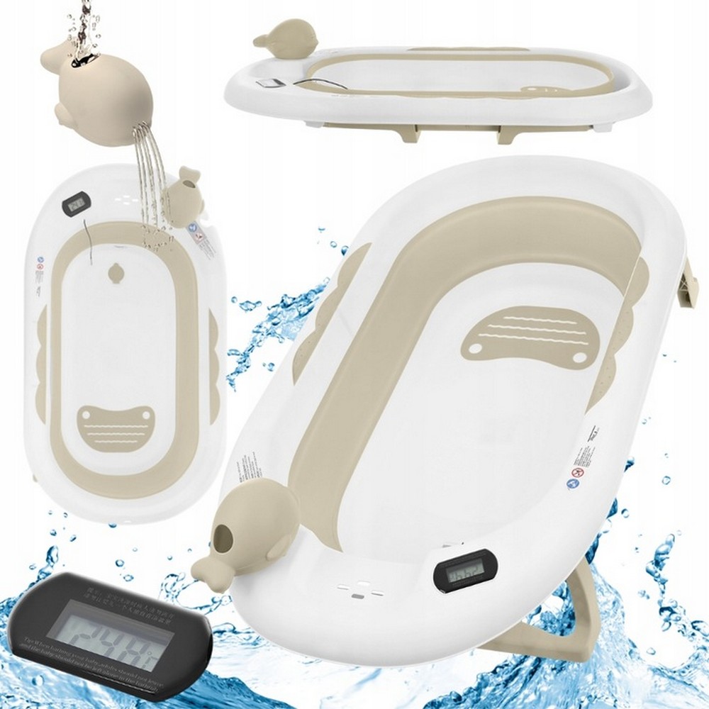 Elektronički termometar omogućit će vam precizno određivanje temperature vode. Uvijek bi trebala biti oko 37 stupnjeva. Jastuk za kupanje bebe rasteretit će roditeljske ruke i podržati bebu u mekom sjedalu. Priložena senzorna igračka olakšat će polijevanje vode po bebinoj glavi. Dodatno, kada ima udubljenje za sapun i ručku za vješanje. Sklopljena lako će stati u skučene prostore u stanu.
